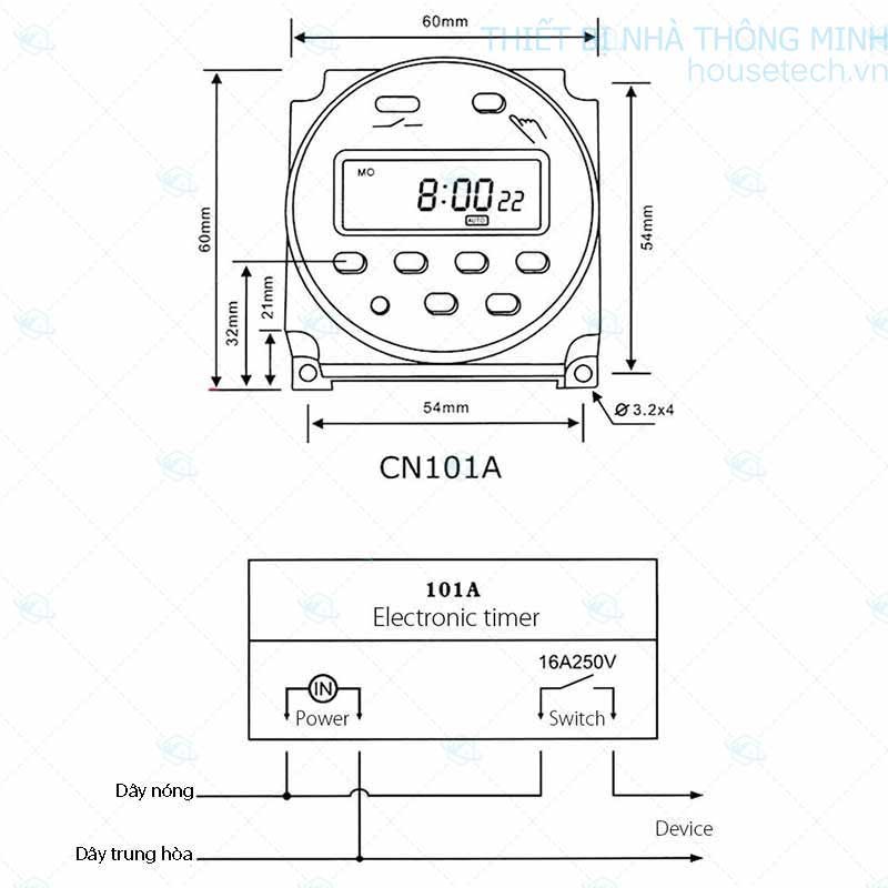 CN101A là công tắc điều khiển thời gian hẹn giờ điện tử thông minh có khả năng bật tắt 17 lần trong ngày. Ngoài ra chiếc timer này còn có khả năng lập lệnh để bật tắt liên tục theo ngày hoặc theo tuần tùy ý của người sử dụng. Công tắc hẹn giờ CN101A có thiết kế dạng tròn, module có chân bắt vít, giúp bắt và gắn thiết bị lên cách bảng công tắc, tủ rack hay máng cáp. Phía trên thiết bị được thiết kế hình tròn, có màn hình hiển thị thông báo và một hệ thống nút bấm bằng cao su. Hệ thống nút này sẽ cho phép chúng ta thiết lập sản phẩm hẹn giờ theo đúng ý của mình.